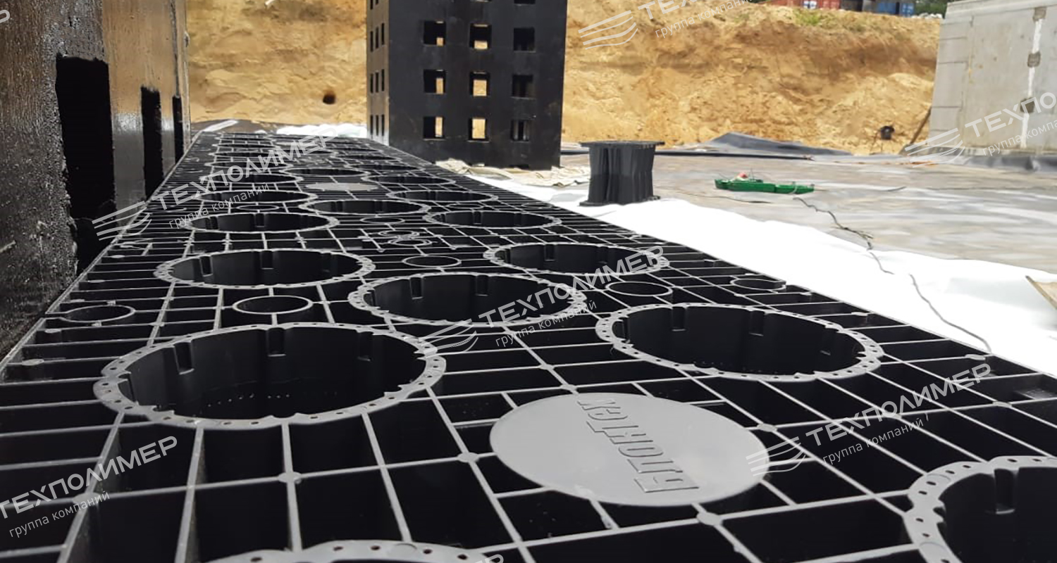 Резервуары «БлокТех» предназначены для накопления воды в случае недопущения пикового сброса дождевой воды в существующие системы канализации, в качестве накопительного резервуара в составе очистных сооружений. Эти резервуары имеют более сложное многослойное покрытие: нетканый геотекстиль, геомембрана и еще один слой геотекстиля. Геомембрана обеспечивает водонепроницаемость, а второй слой геотекстильного полотна защищает ее от прокола. Преимущество резервуаров «БлокТех» перед другими решениями для накопления и инфильтрации воды — в компактном размере. Модули складываются один в другой, что сокращает объем перевозимого материала не менее, чем в 4 раза по сравнению с другими решениями. Для транспортировки всех элементов «БлокТех», необходимых для возведения резервуара объемом 300 м³, требуется всего 1 еврофура.