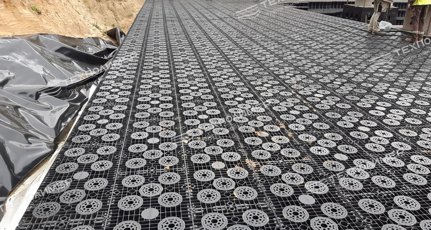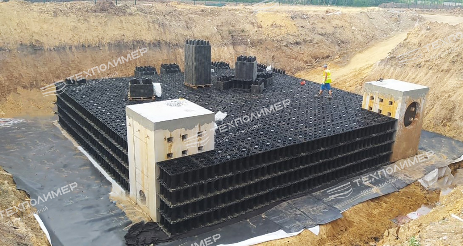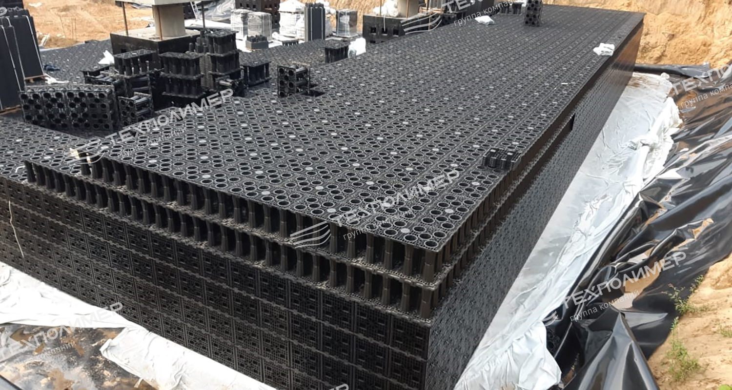 Резервуары «БлокТех» предназначены для инфильтрации — устройства дождевой канализации без возможности подключения к существующим системам канализации или уменьшения нагрузки на существующие сети канализации в случае подключения к ним. Собранный из модулей резервуар для инфильтрации воды покрывается нетканым геотекстилем. Дождевая вода попадает внутрь, накапливается и постепенно просачивается в почву сквозь геотекстильное полотно..